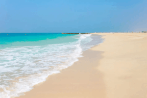 Den beboede strand tilbyder en langt mere fredelig sandstrækning.
